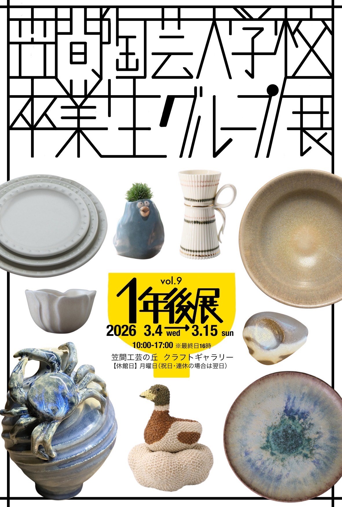 笠間陶芸大学校の卒業生9名による注目のグループ展を開催します。展示会では、大学校で培った高度な陶芸技術と創作力を活かし、卒業後1年を経て進化した作品の数々をご覧いただけます。ぜひお越しください。